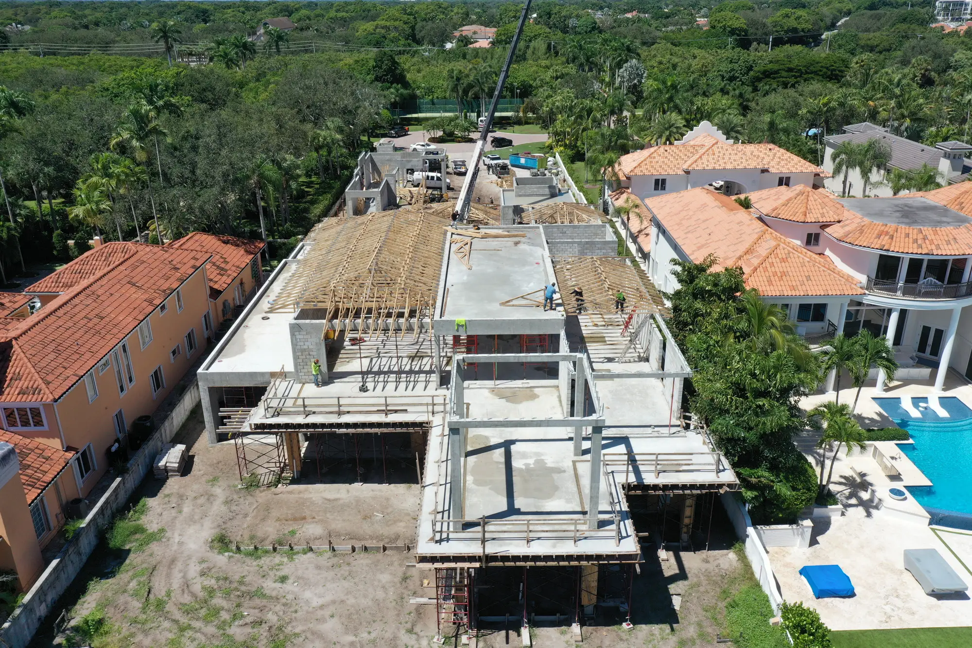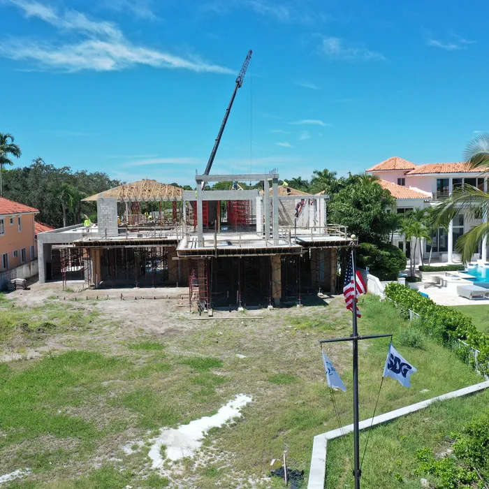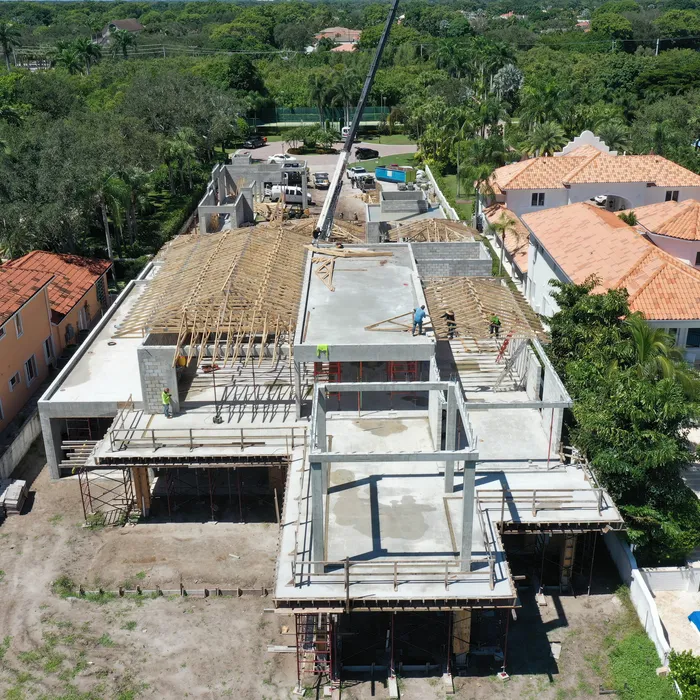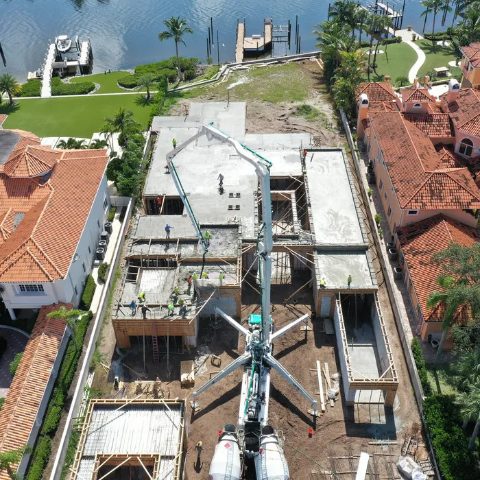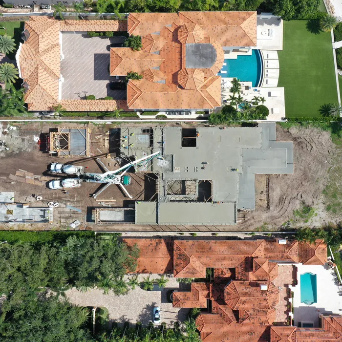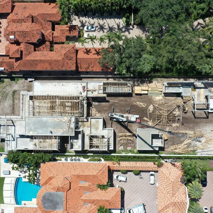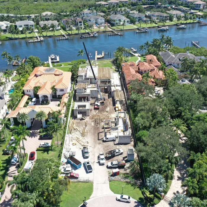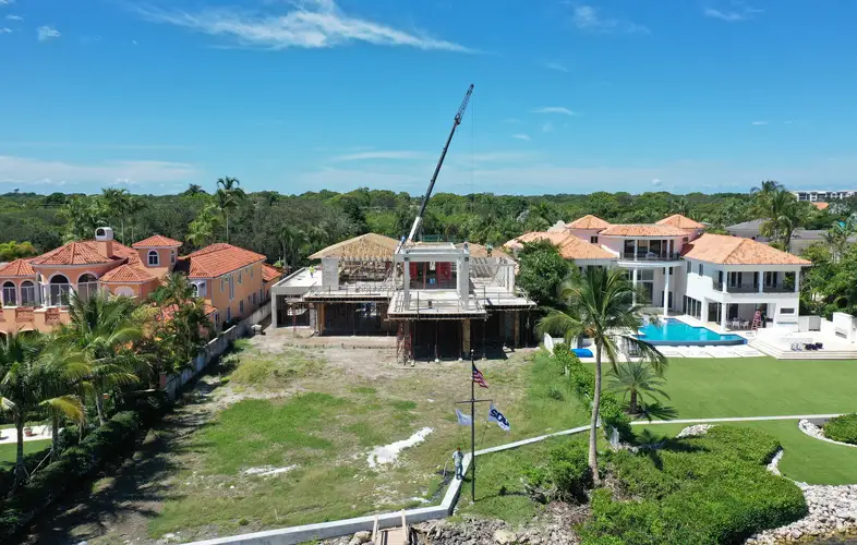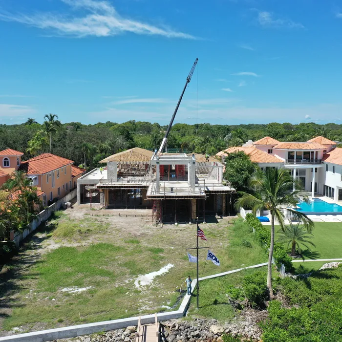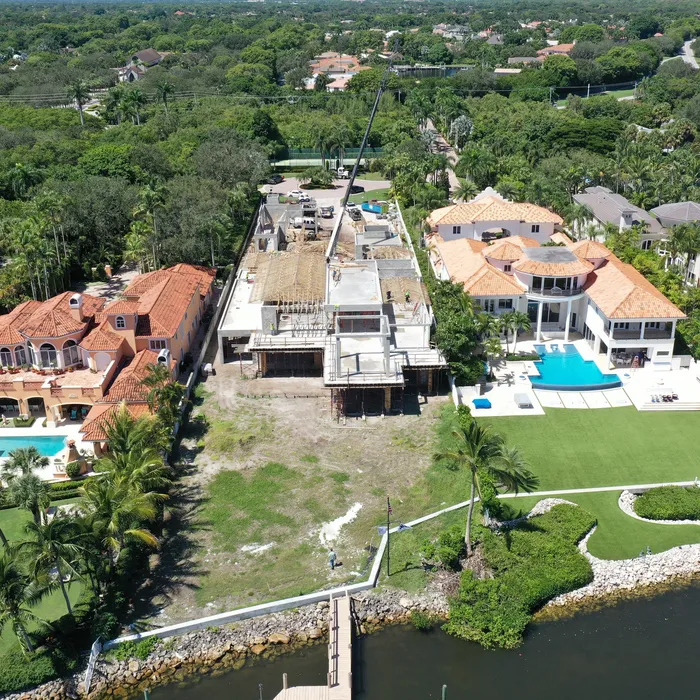 This magnificent waterfront estate features extensive outdoor living spaces, private dock facilities, and meticulously landscaped grounds that maximize the stunning intracoastal views and water access. The aerial construction documentation reveals the impressive complexity of the multi-level design, sophisticated concrete work, and precision framing systems required to create the expansive living spaces and covered outdoor areas. The combination of prime intracoastal location, substantial square footage, and advanced construction techniques creates a residence that exemplifies luxury waterfront living while showcasing Shellco's expertise in executing complex residential projects in South Florida's most desirable waterfront locations.