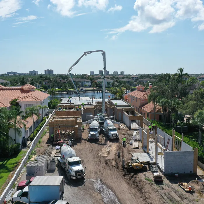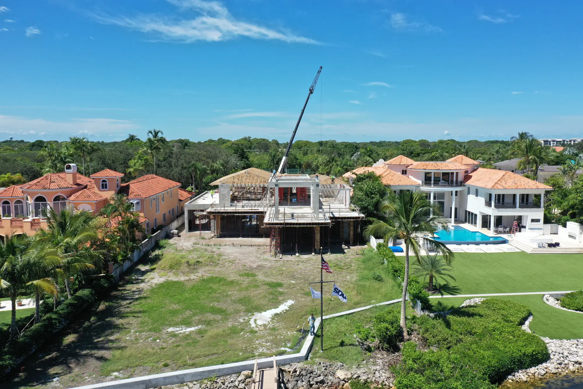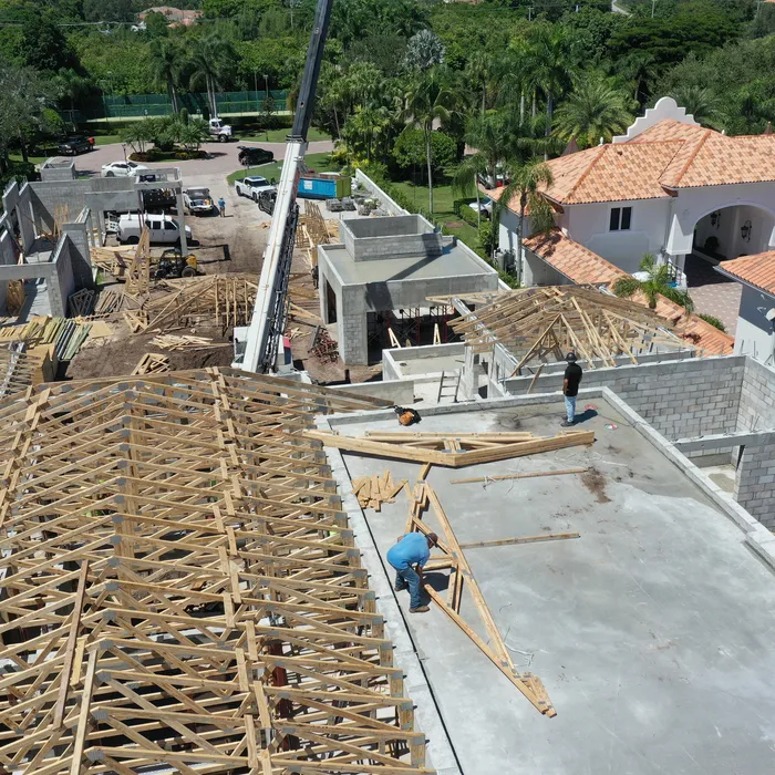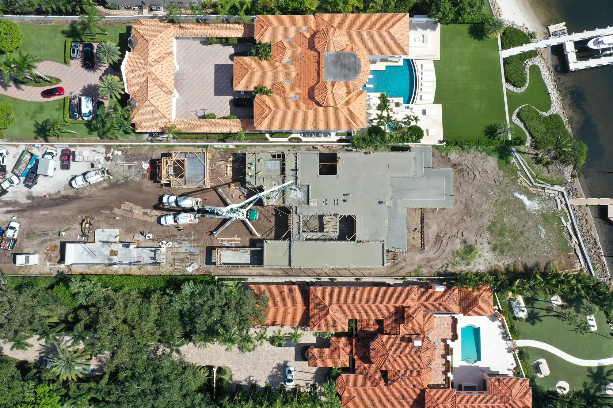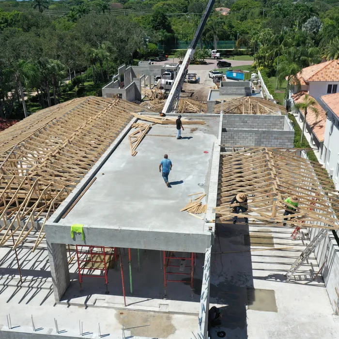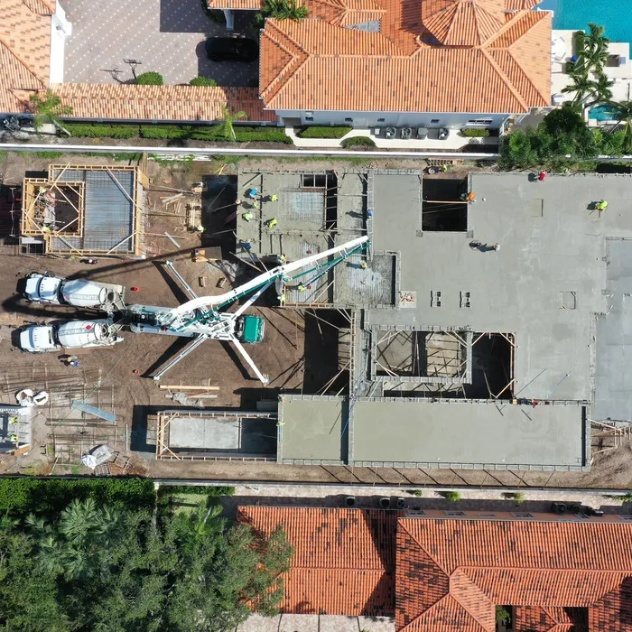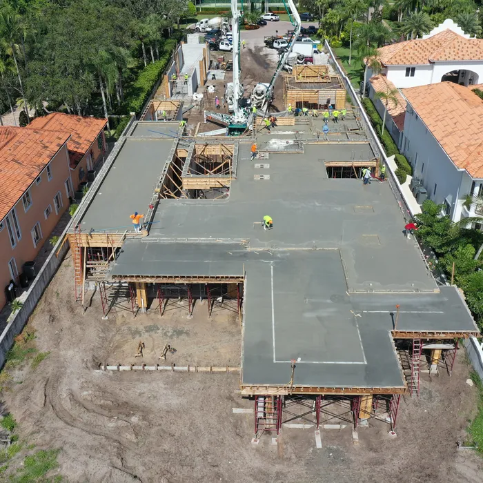 This magnificent waterfront estate features extensive outdoor living spaces, private dock facilities, and meticulously landscaped grounds that maximize the stunning intracoastal views and water access. The aerial construction documentation reveals the impressive complexity of the multi-level design, sophisticated concrete work, and precision framing systems required to create the expansive living spaces and covered outdoor areas. The combination of prime intracoastal location, substantial square footage, and advanced construction techniques creates a residence that exemplifies luxury waterfront living while showcasing Shellco's expertise in executing complex residential projects in South Florida's most desirable waterfront locations.