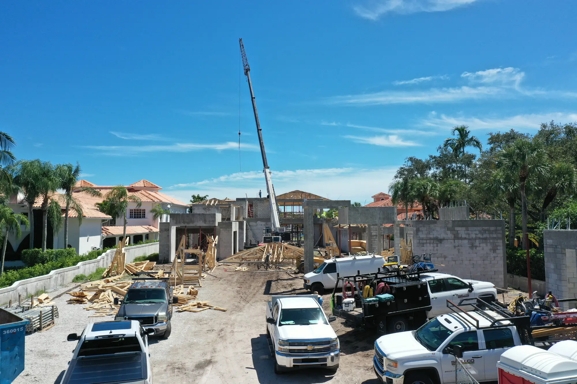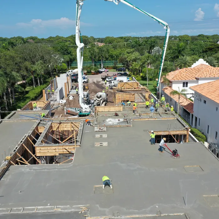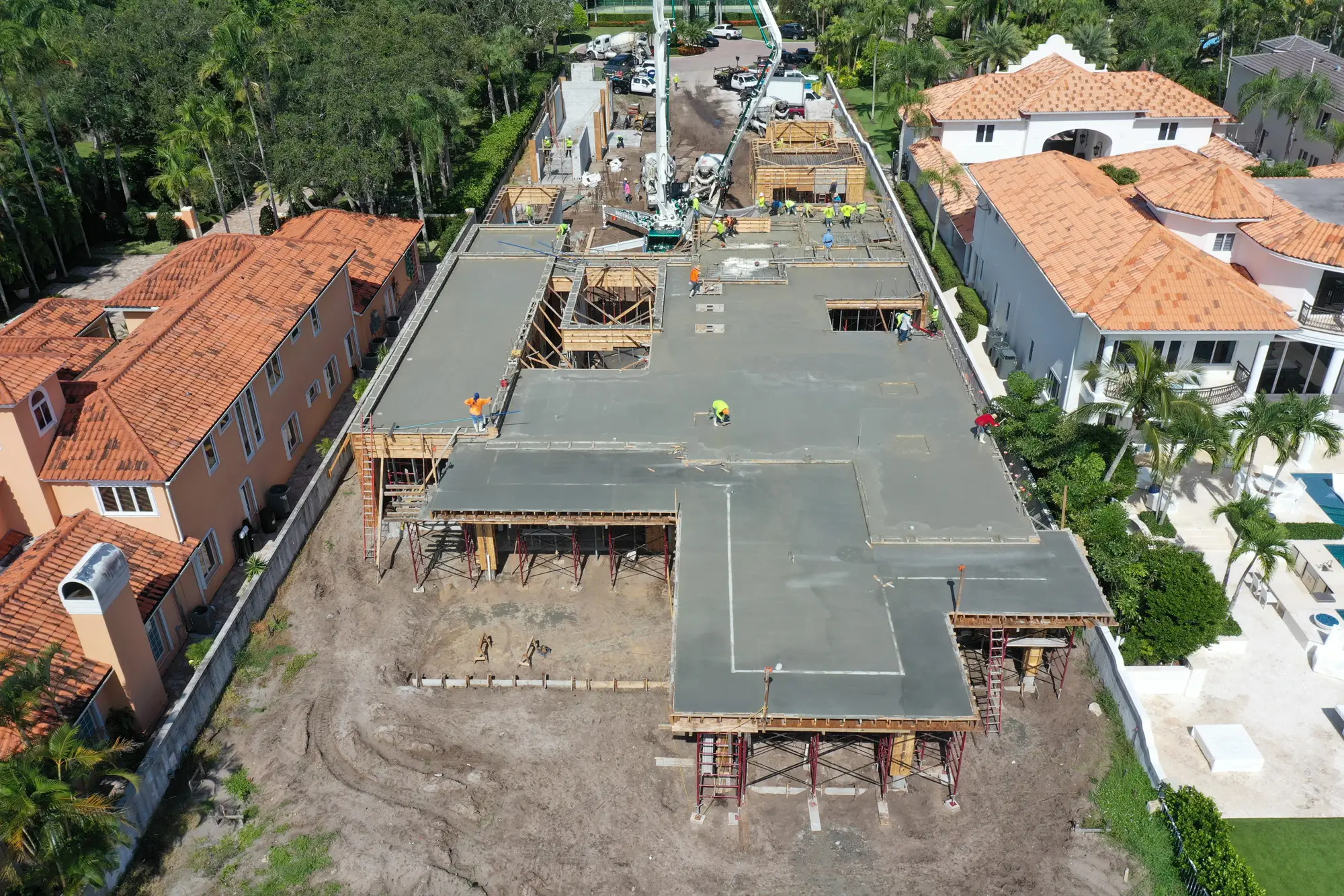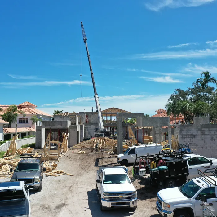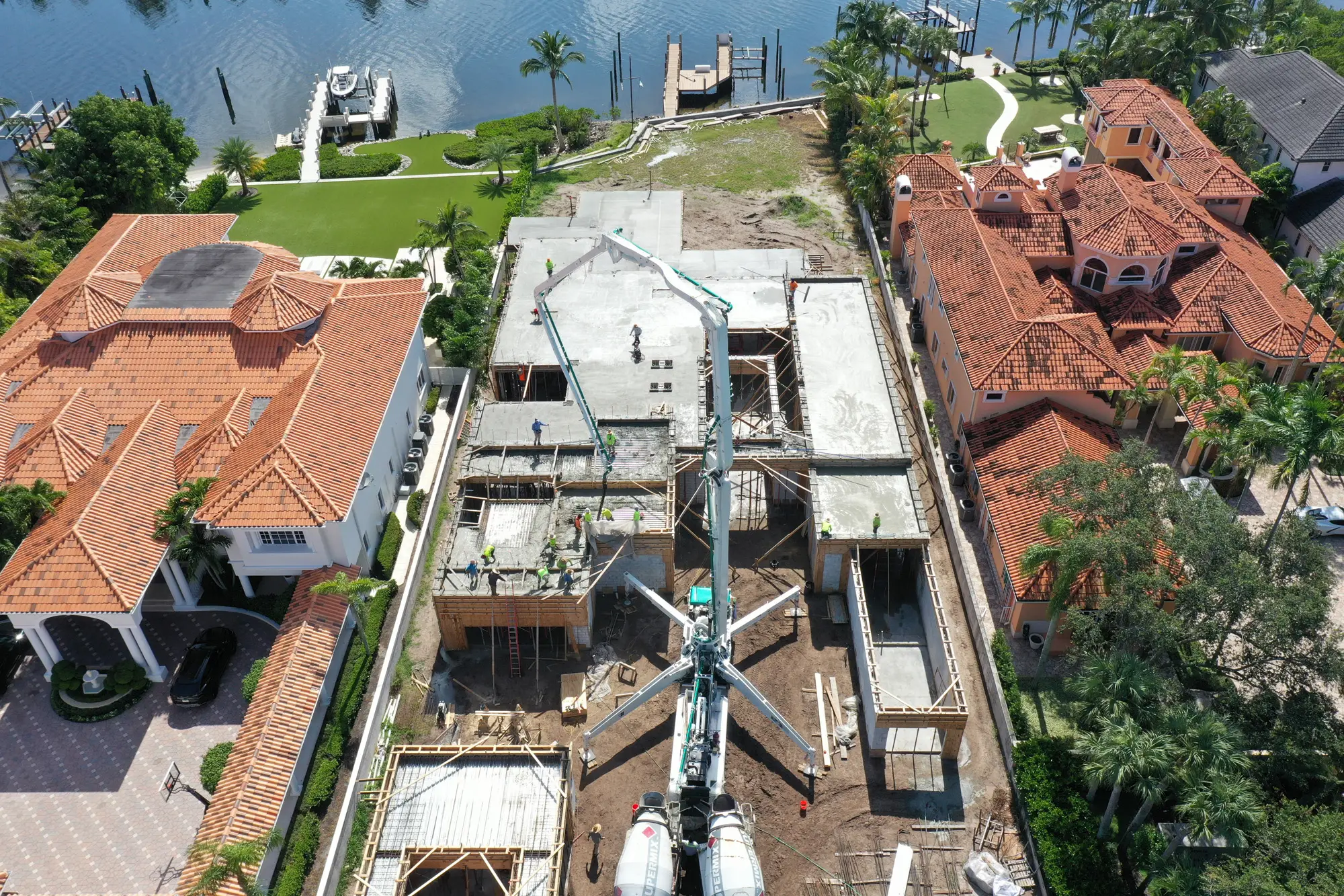 This magnificent waterfront estate features extensive outdoor living spaces, private dock facilities, and meticulously landscaped grounds that maximize the stunning intracoastal views and water access. The aerial construction documentation reveals the impressive complexity of the multi-level design, sophisticated concrete work, and precision framing systems required to create the expansive living spaces and covered outdoor areas. The combination of prime intracoastal location, substantial square footage, and advanced construction techniques creates a residence that exemplifies luxury waterfront living while showcasing Shellco's expertise in executing complex residential projects in South Florida's most desirable waterfront locations.