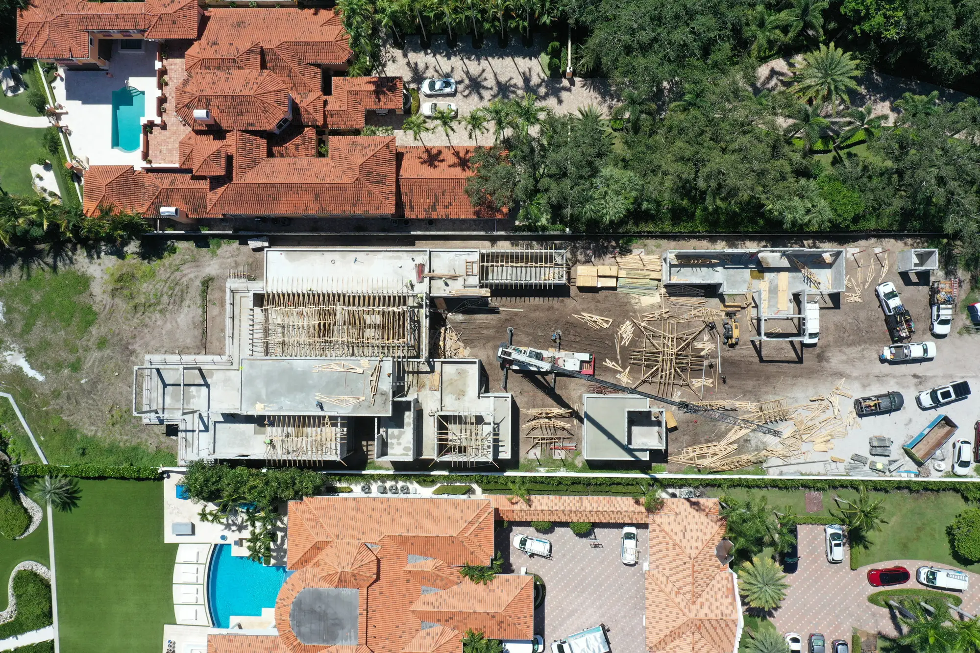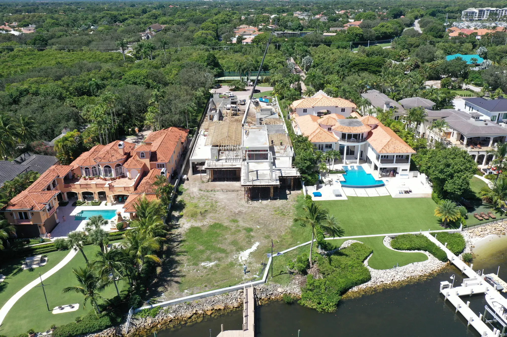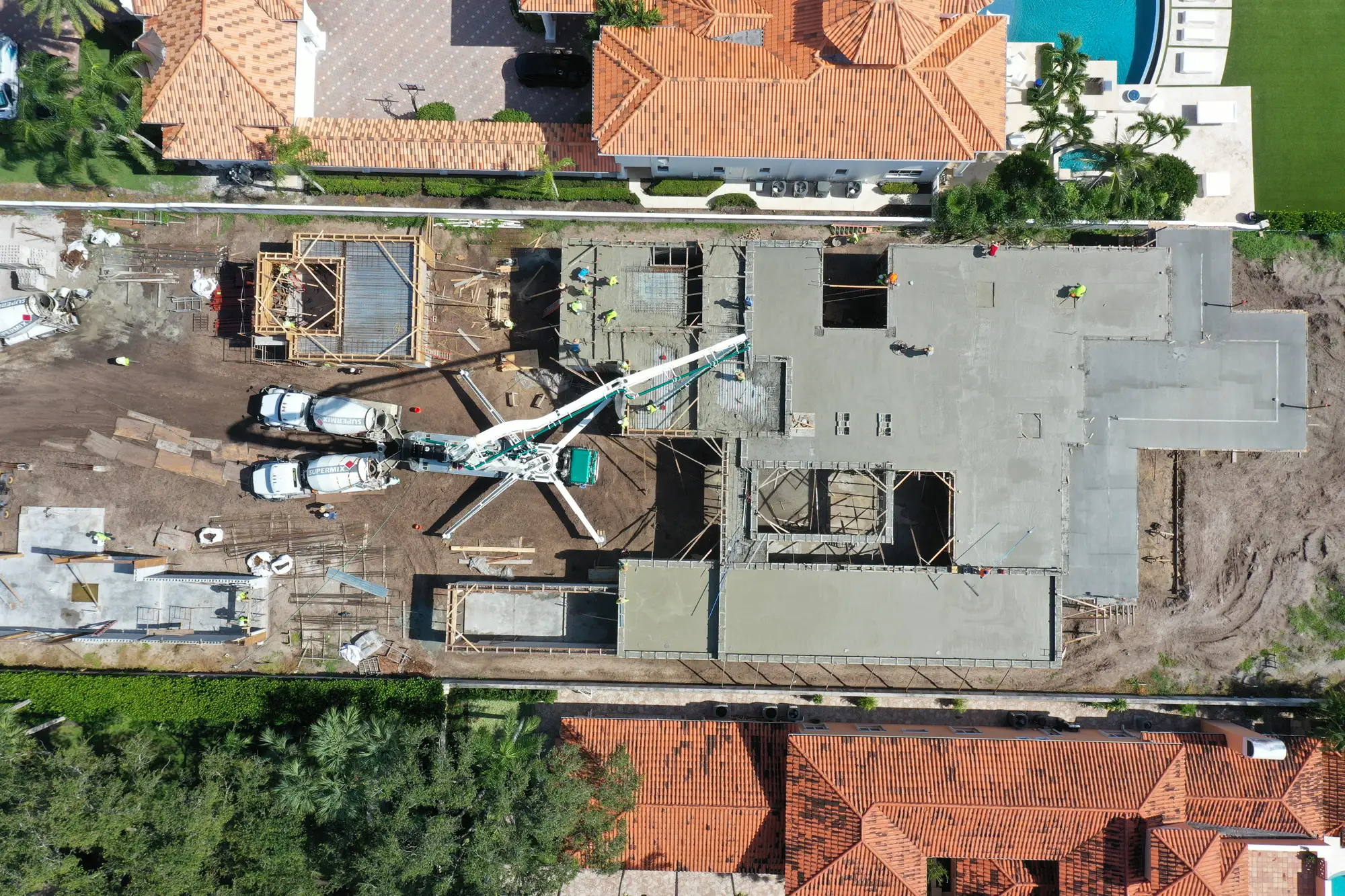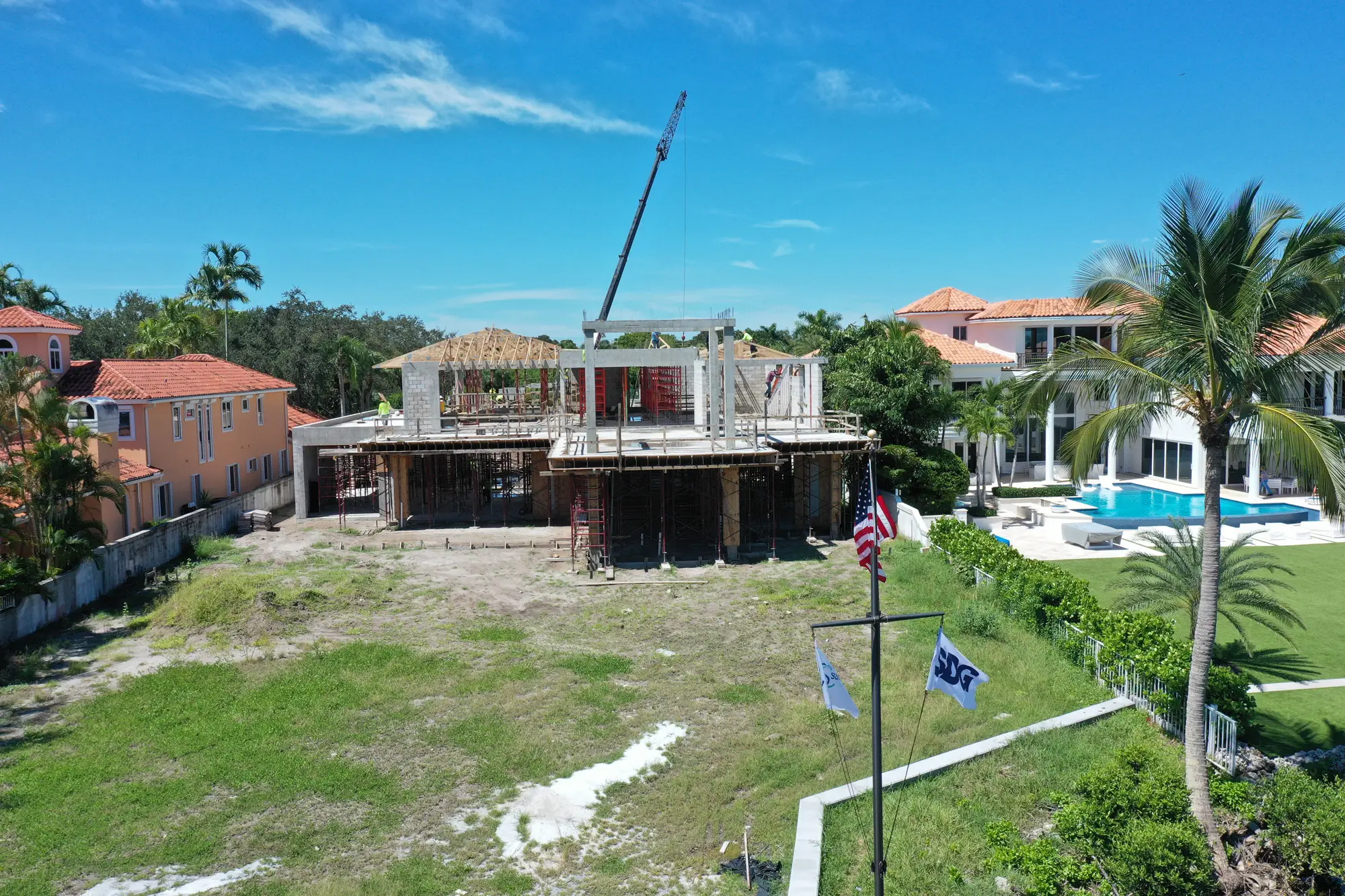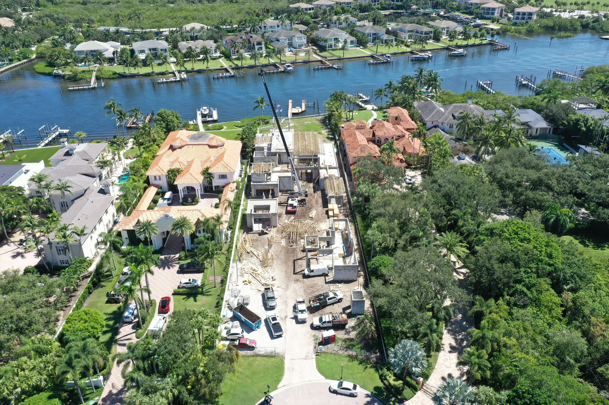 This magnificent waterfront estate features extensive outdoor living spaces, private dock facilities, and meticulously landscaped grounds that maximize the stunning intracoastal views and water access. The aerial construction documentation reveals the impressive complexity of the multi-level design, sophisticated concrete work, and precision framing systems required to create the expansive living spaces and covered outdoor areas. The combination of prime intracoastal location, substantial square footage, and advanced construction techniques creates a residence that exemplifies luxury waterfront living while showcasing Shellco's expertise in executing complex residential projects in South Florida's most desirable waterfront locations.