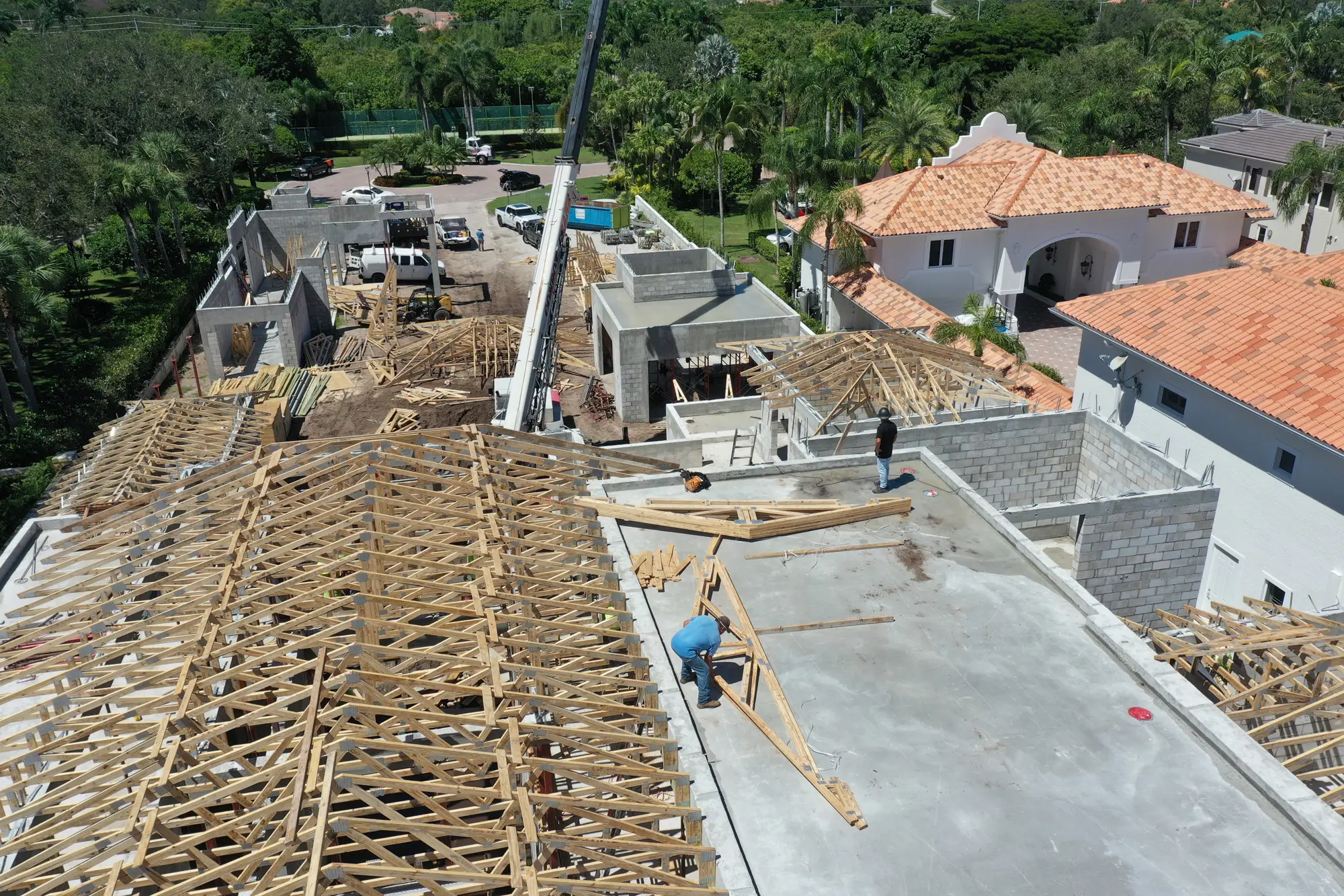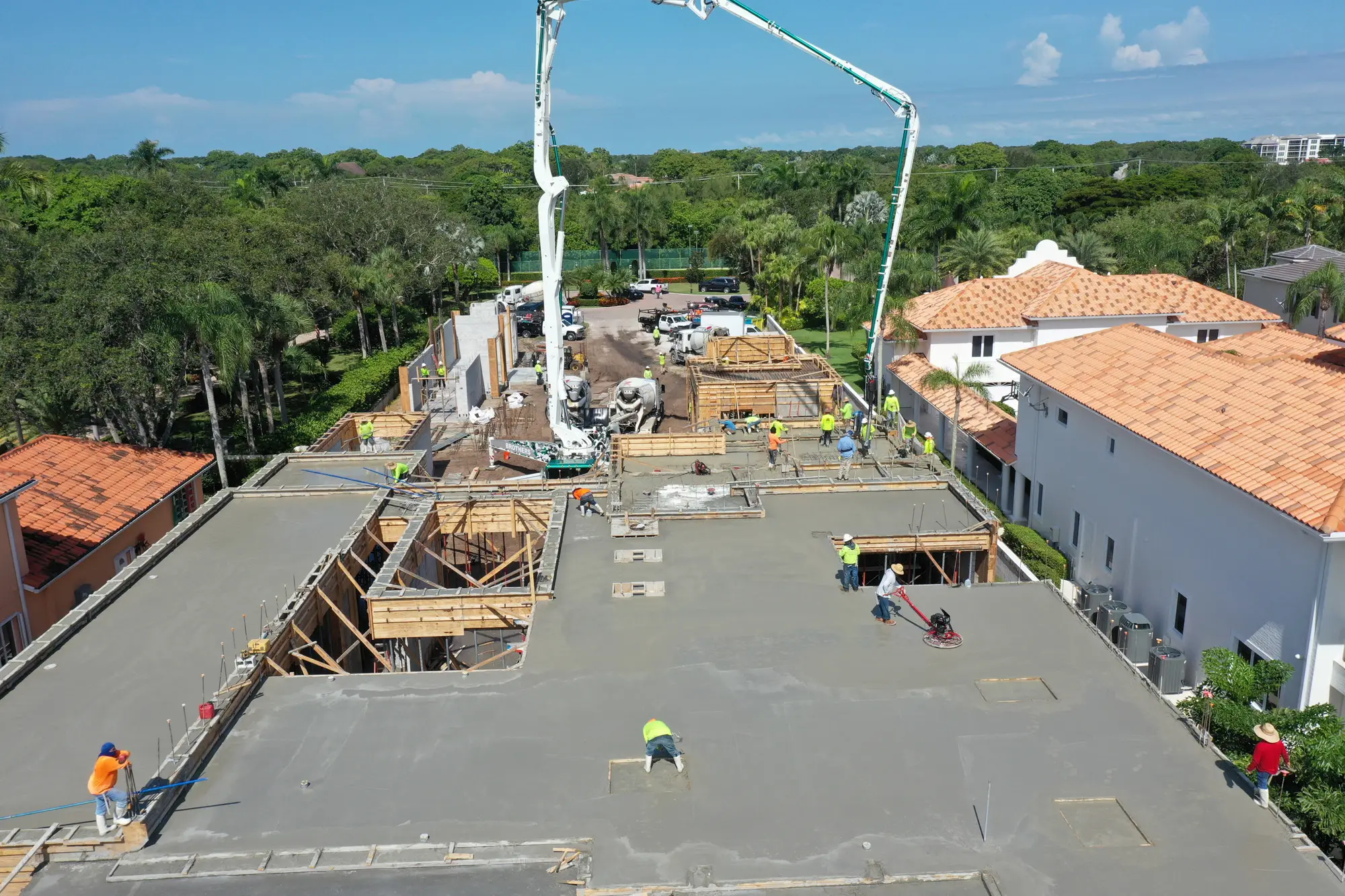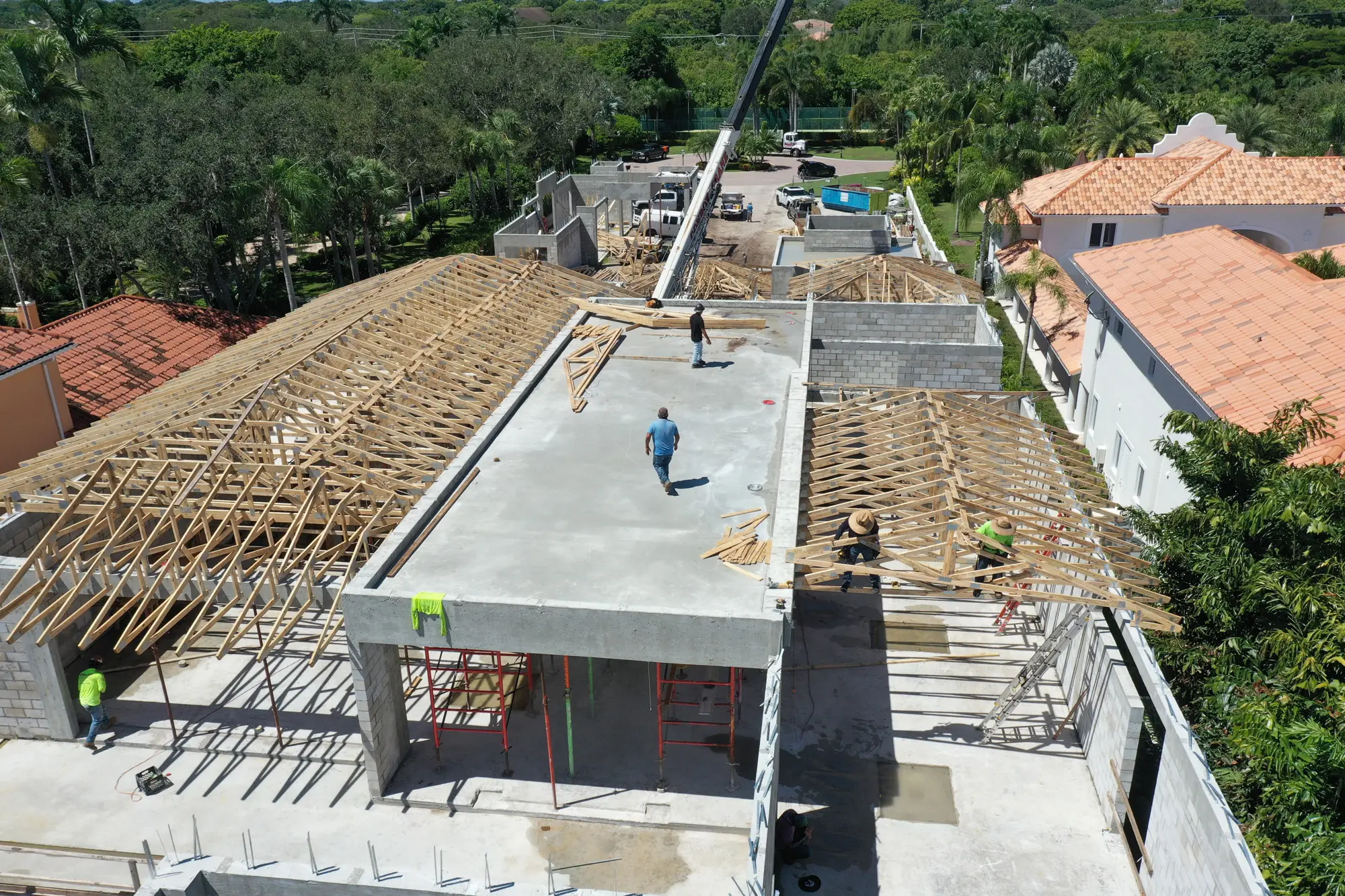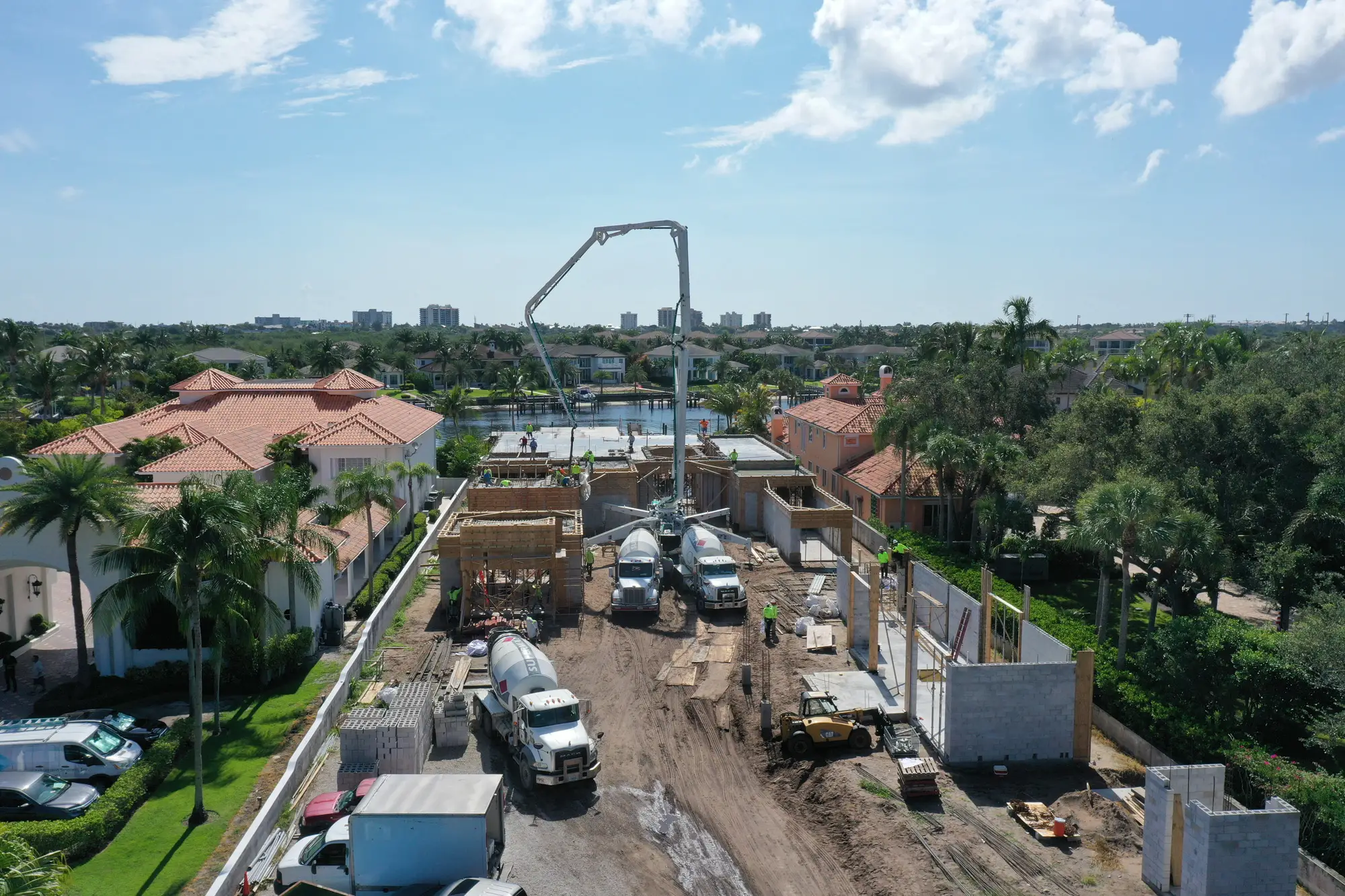 This magnificent waterfront estate features extensive outdoor living spaces, private dock facilities, and meticulously landscaped grounds that maximize the stunning intracoastal views and water access. The aerial construction documentation reveals the impressive complexity of the multi-level design, sophisticated concrete work, and precision framing systems required to create the expansive living spaces and covered outdoor areas. The combination of prime intracoastal location, substantial square footage, and advanced construction techniques creates a residence that exemplifies luxury waterfront living while showcasing Shellco's expertise in executing complex residential projects in South Florida's most desirable waterfront locations.