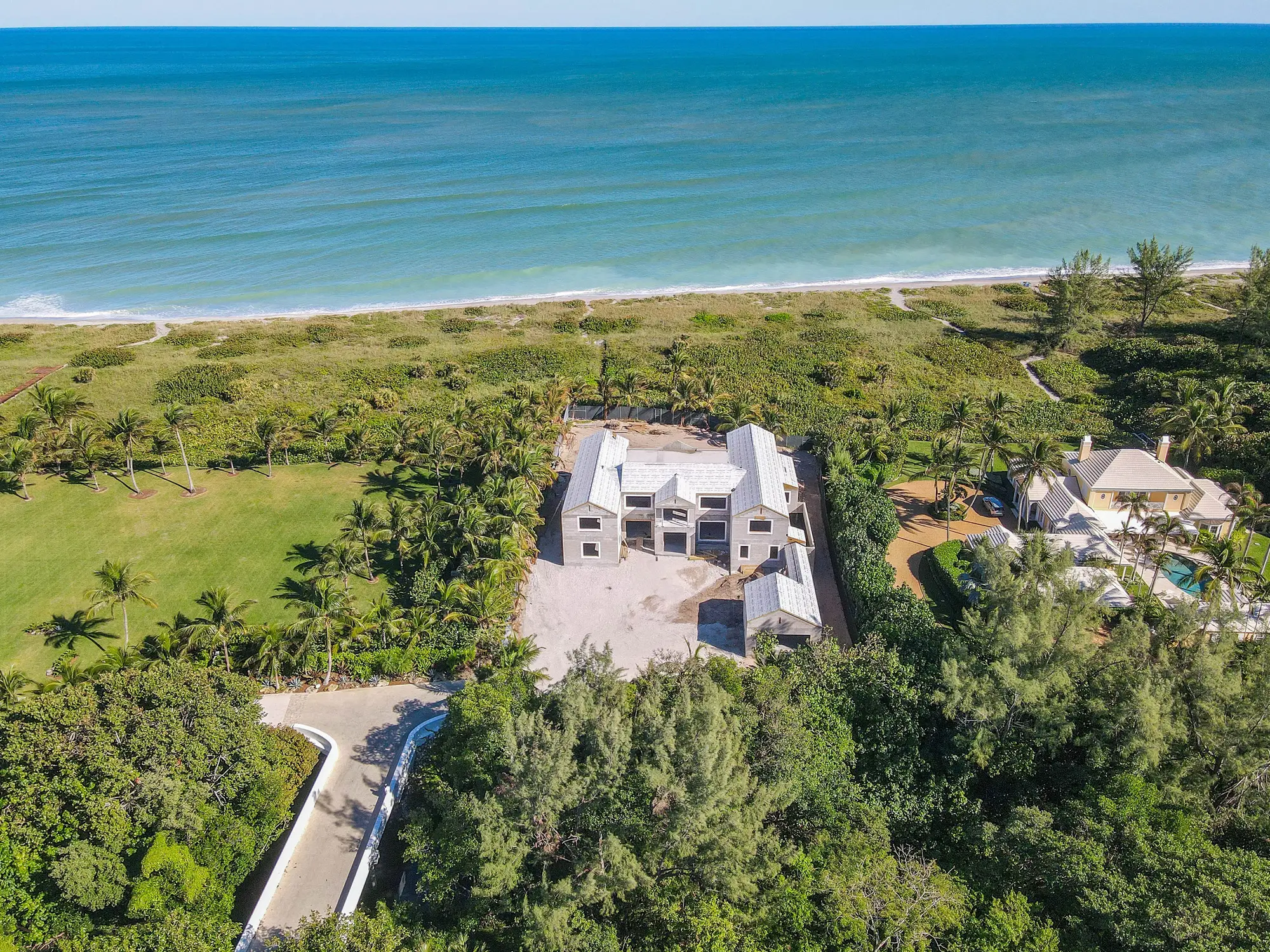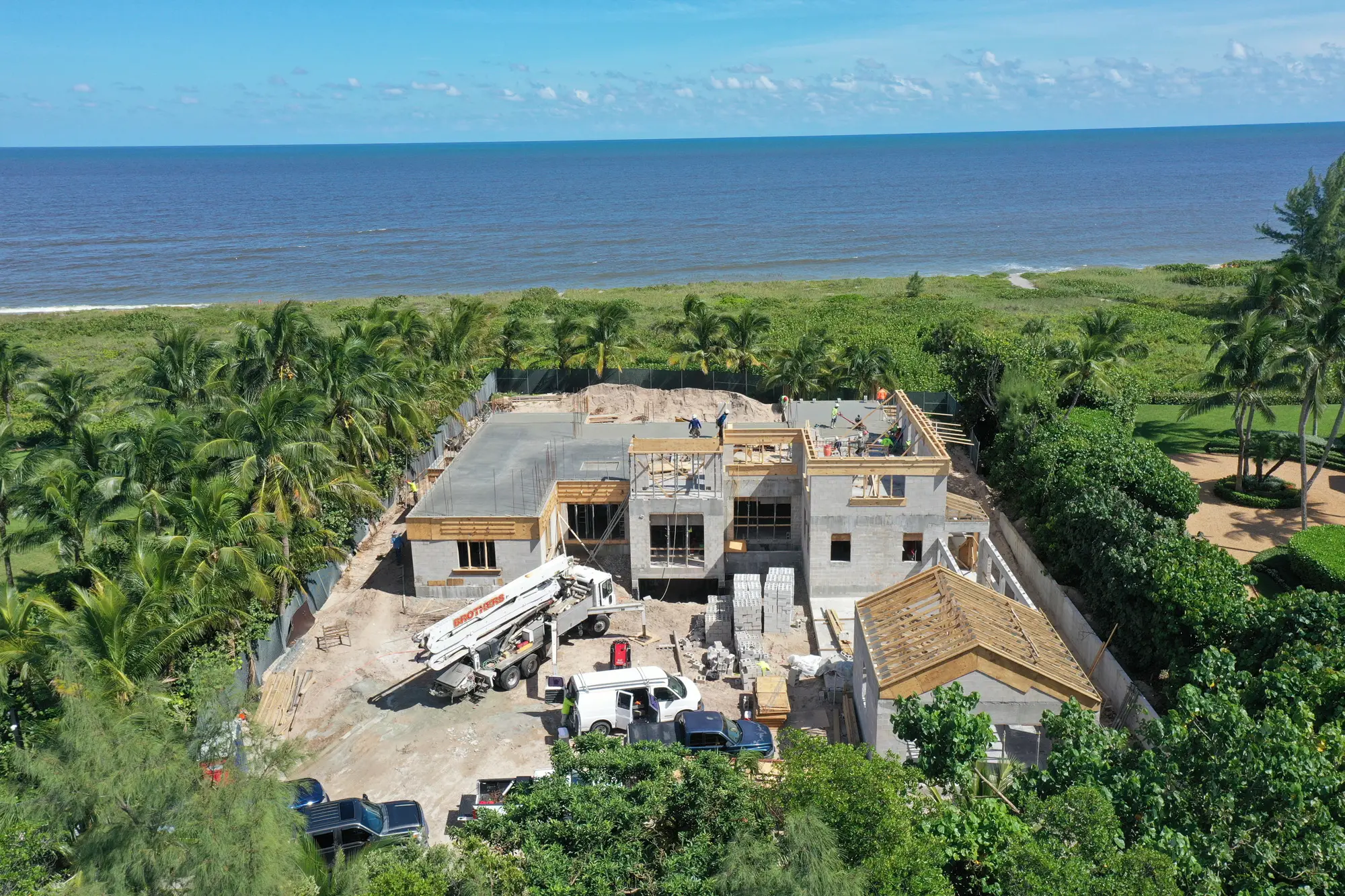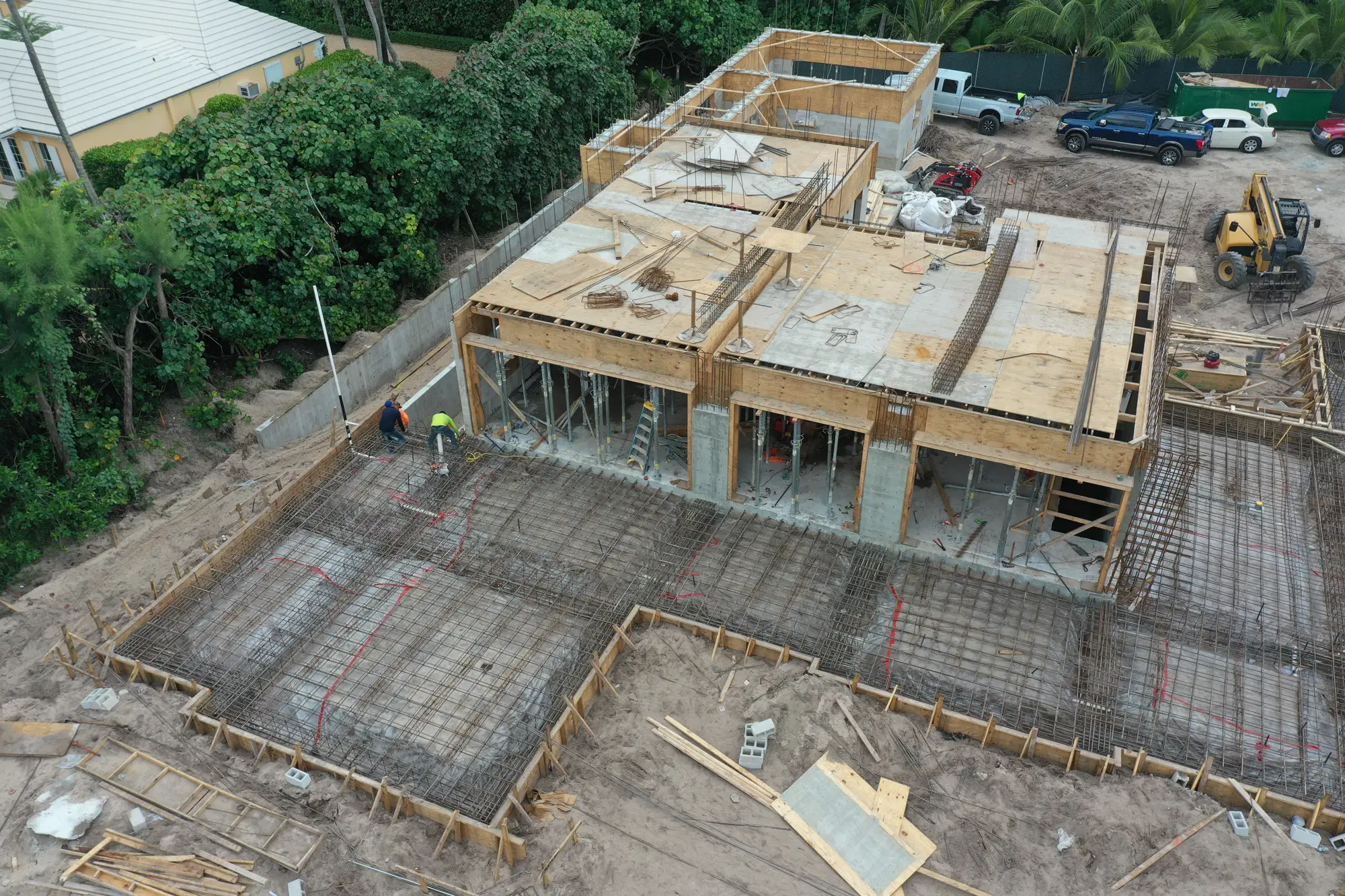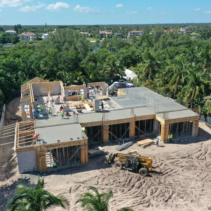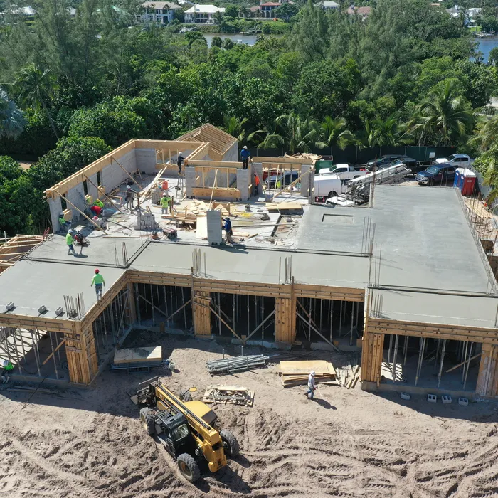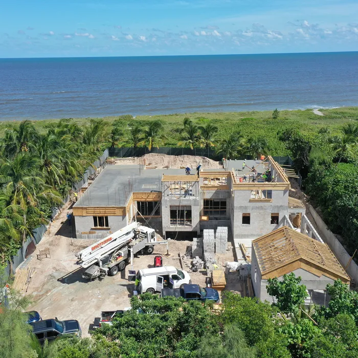This remarkable estate represents a pinnacle of oceanfront construction complexity, requiring specialized waterproofing and structural systems to create multiple below-grade levels in the challenging coastal environment. The aerial construction documentation reveals the extensive rebar work and precision concrete placement required for the multi-level basement construction, including the innovative two-level parking system and basement gym facilities. The combination of Jupiter Island's coveted direct ocean access, substantial acreage, and the technical achievement of multi-level basement construction creates a residence that exemplifies luxury oceanfront living while showcasing Shellco's expertise in executing the most complex residential projects in Florida's premier coastal locations.