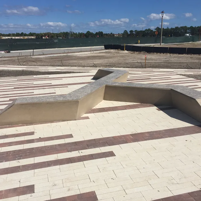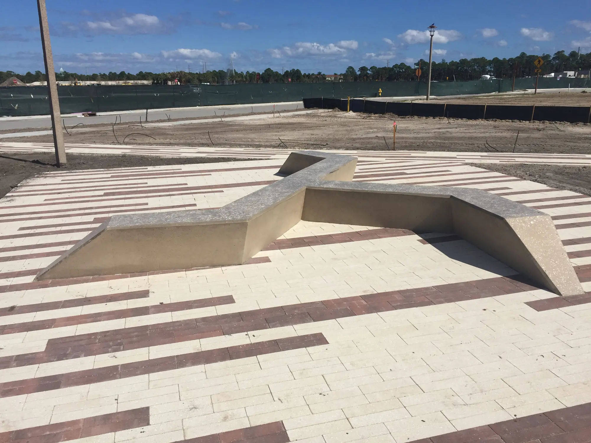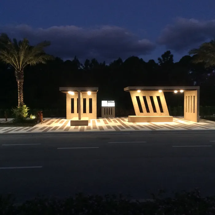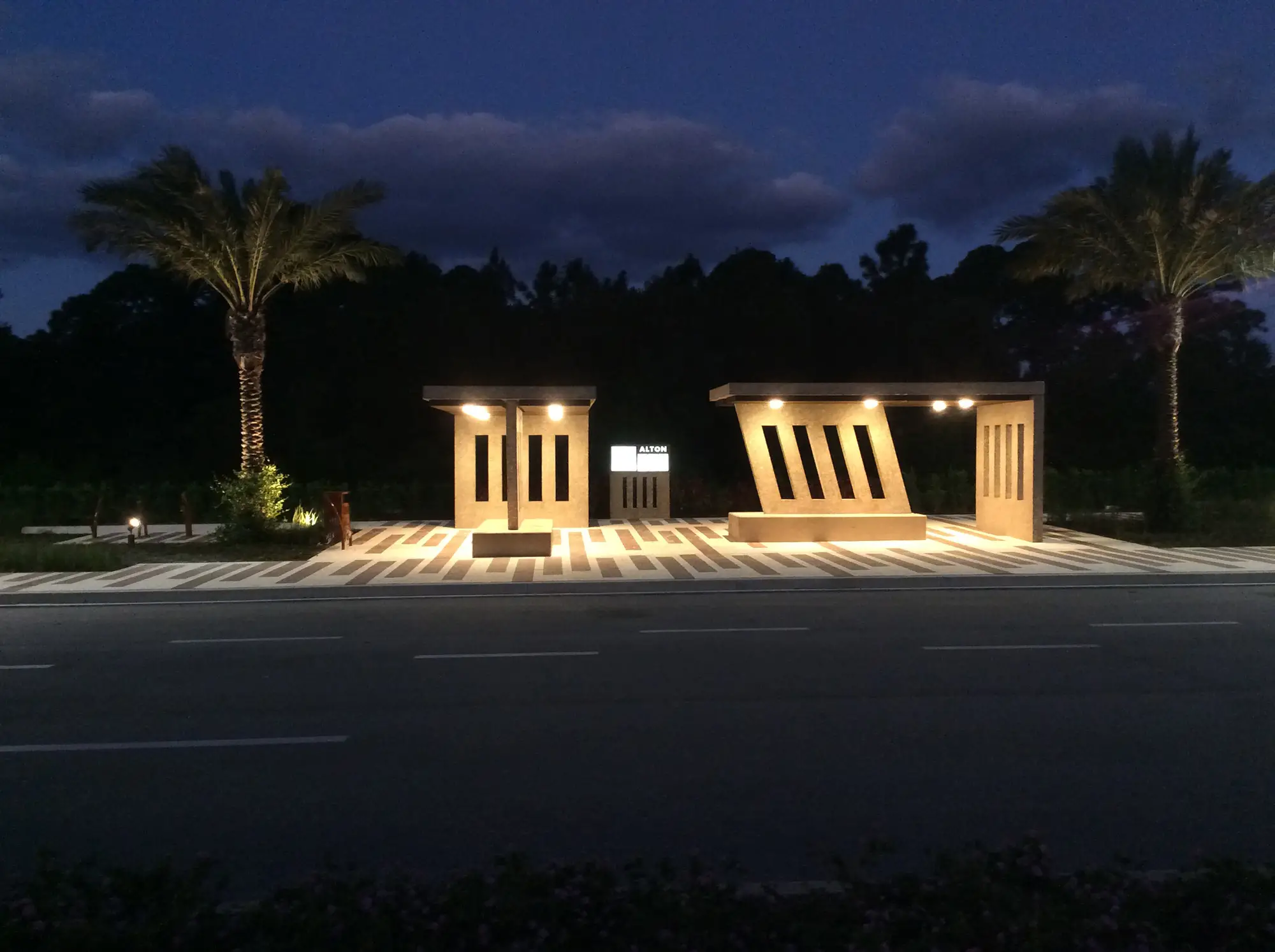 Shellco Construction delivered an extensive decorative concrete package for Alton, featuring multiple style benches, signage systems, and a cantilevering bus shelter crafted from Mesa Beige exposed aggregate concrete with specialized polishing and sandblasting techniques. The project showcased advanced concrete finishing methods, including hand-seeded tabby coquina shell aggregate that was later polished and sandblasted to achieve the desired exposed aggregate effect throughout the development.